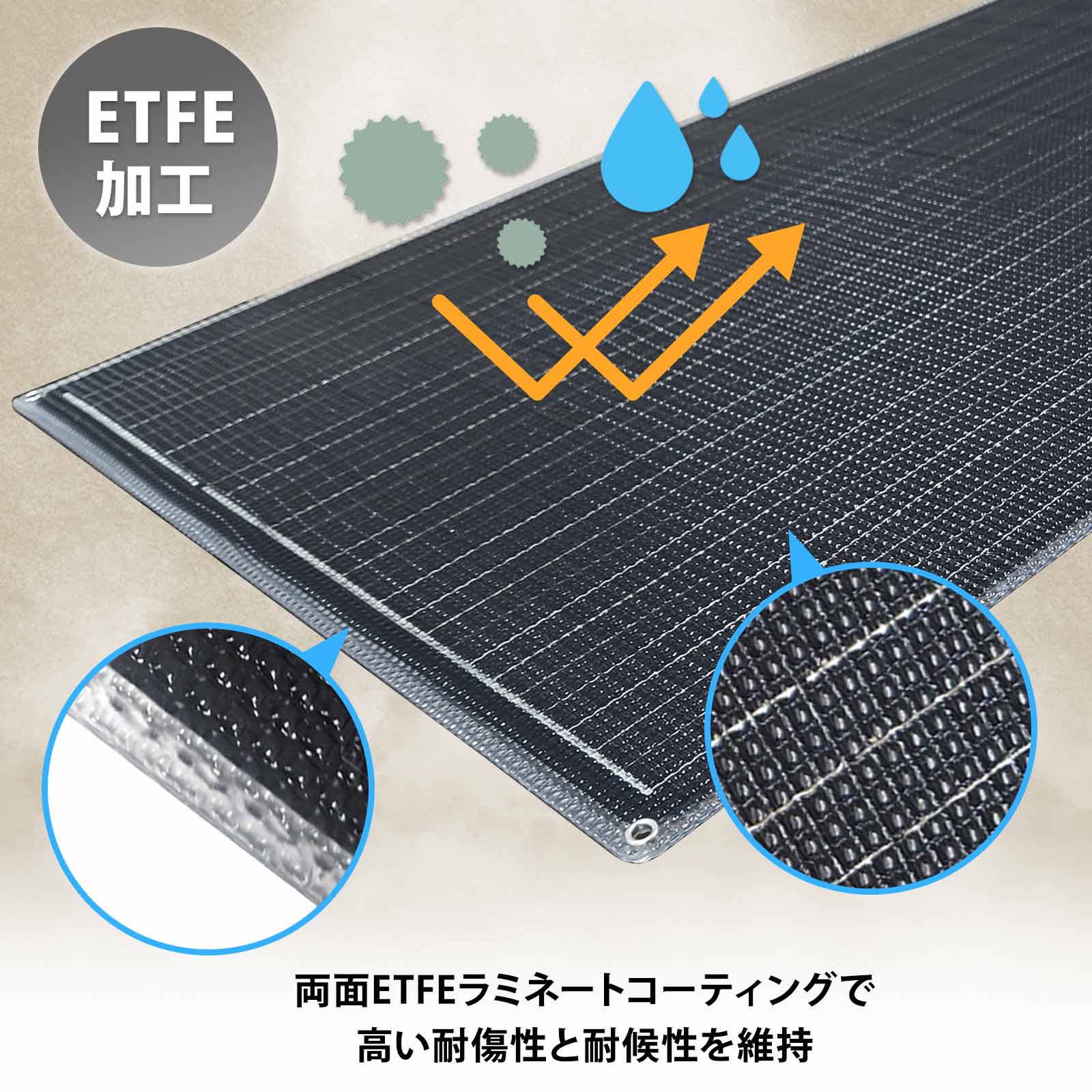 ETFEコーティングを前面だけではなく両面からコーティングすることで、特徴である高耐性を最大限に活かせる構造のソーラーパネルです。